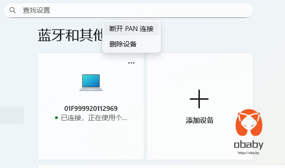- 连接状态显示在热点设备名称下的 “其他设备 ”中。 若要断开与蓝牙个人区域网络的连接,请遵循相同的步骤连接到热点设备,但选择“ 断开 PAN 连接 ”按钮,而不是“ 连接 ”按钮。