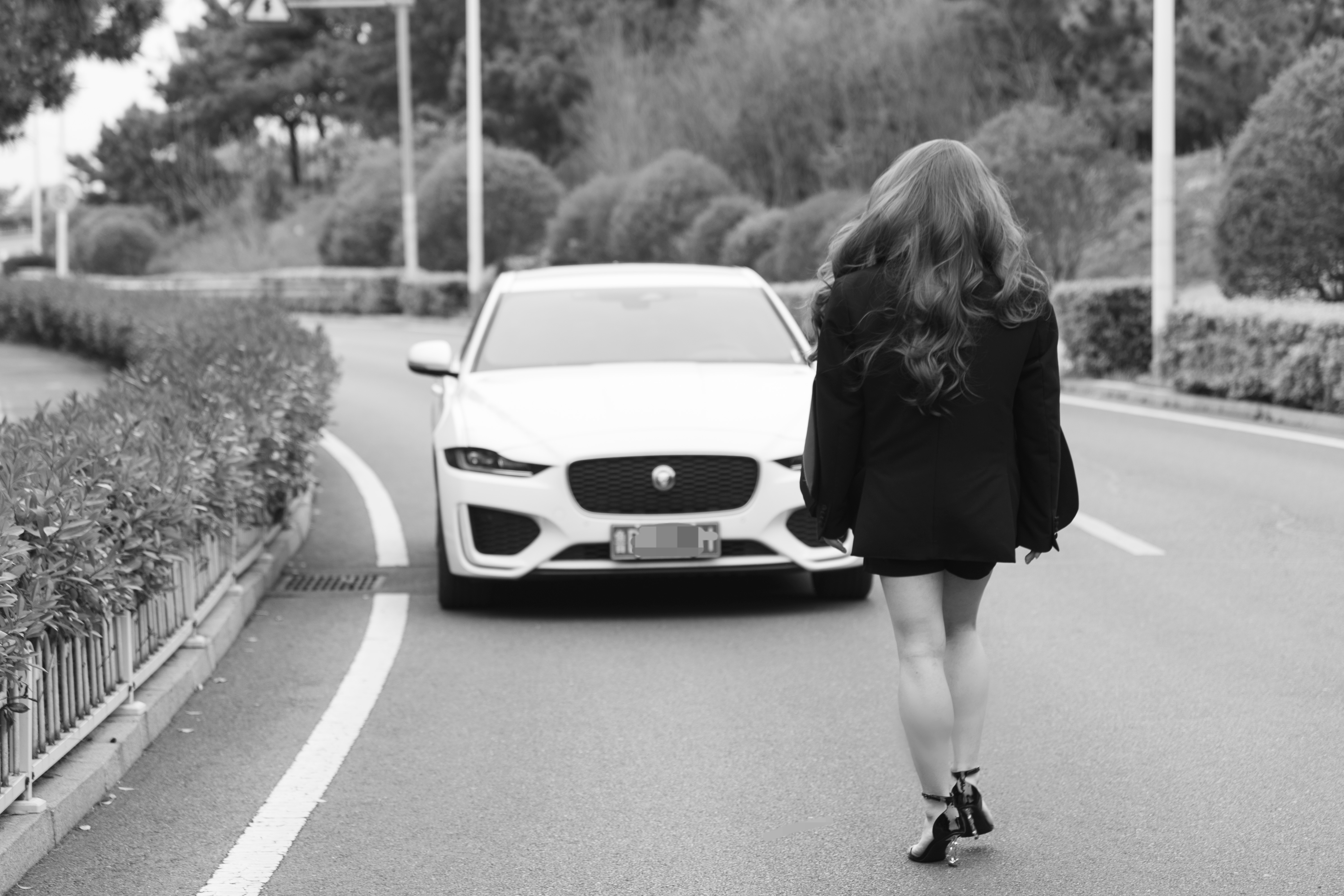 摄影师提议可以坐引擎盖上拍几张,第一次尝试失败了。化妆师小姐姐说:“穿的高跟鞋不太好跳”