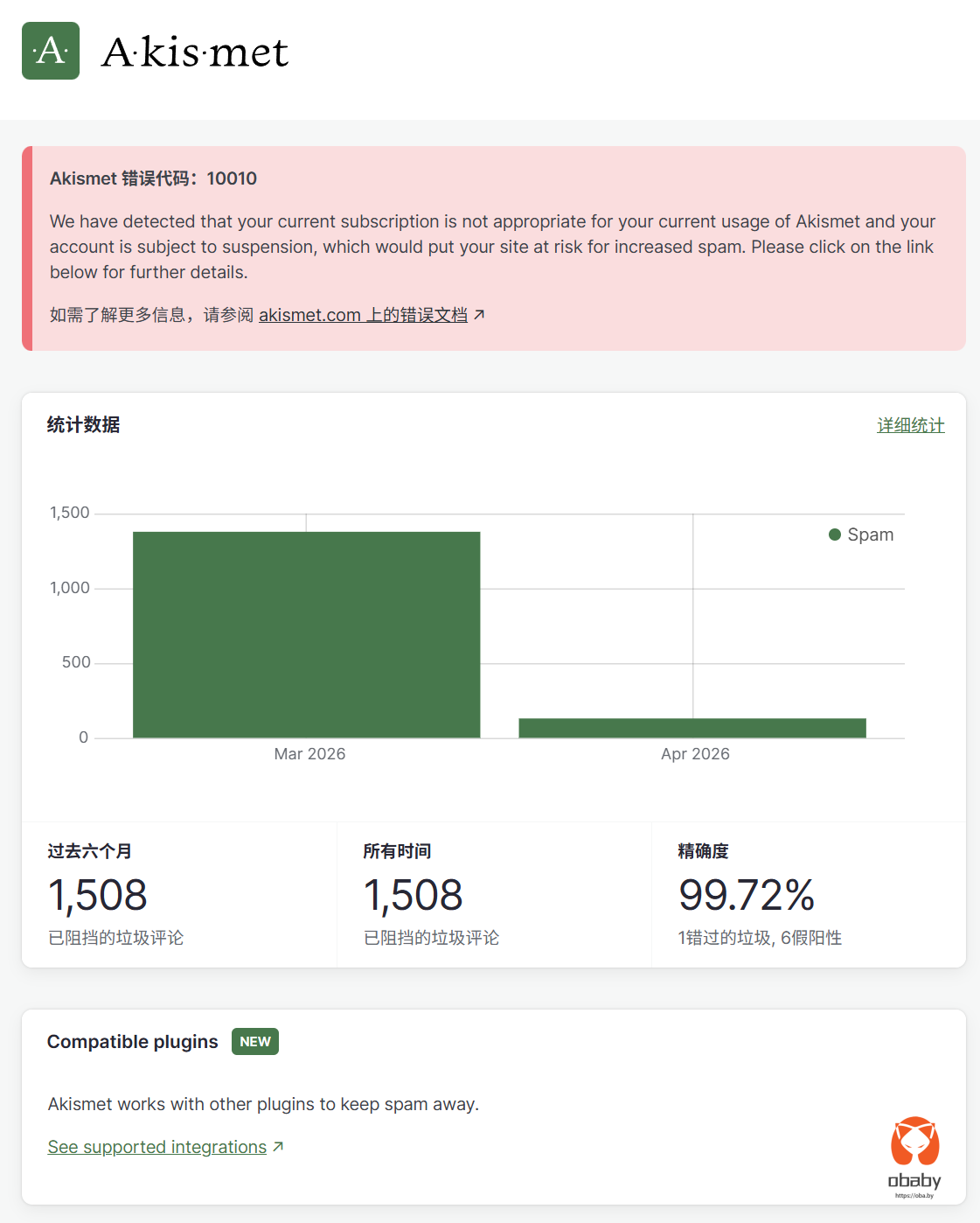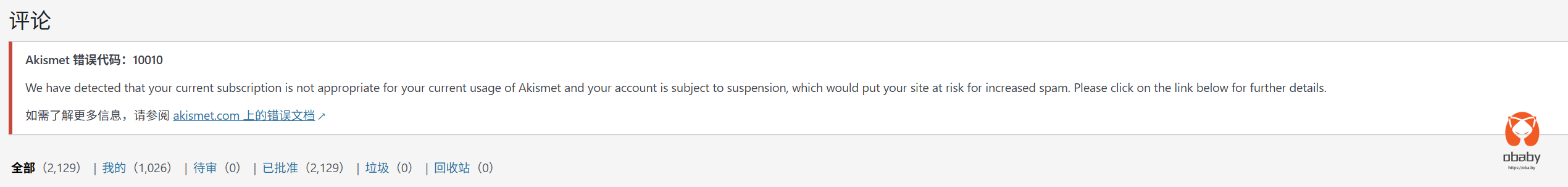 很久之前,就经常收到akismet的授权提醒,对应一个错误码10010。
