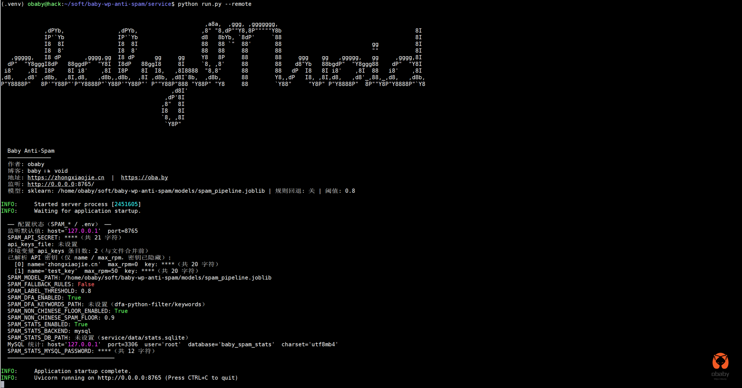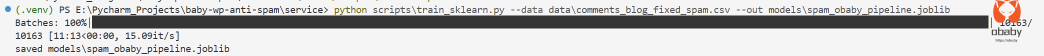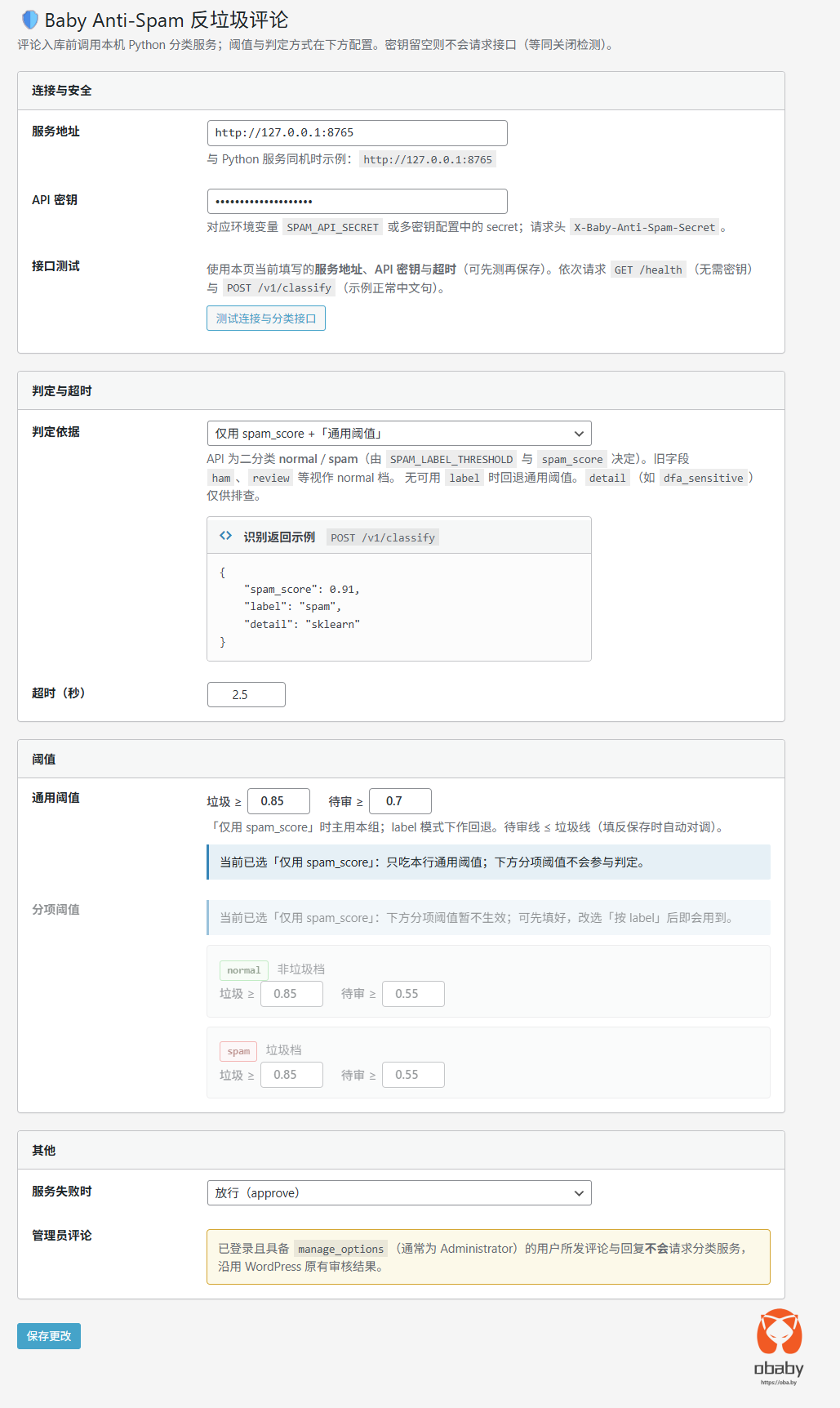 说明:如果自己不想训练数据,下载发布版的spam_pipeline.joblib 放入指定目录下配置服务启动即可,baby-anti-spam.zip 为wp插件。