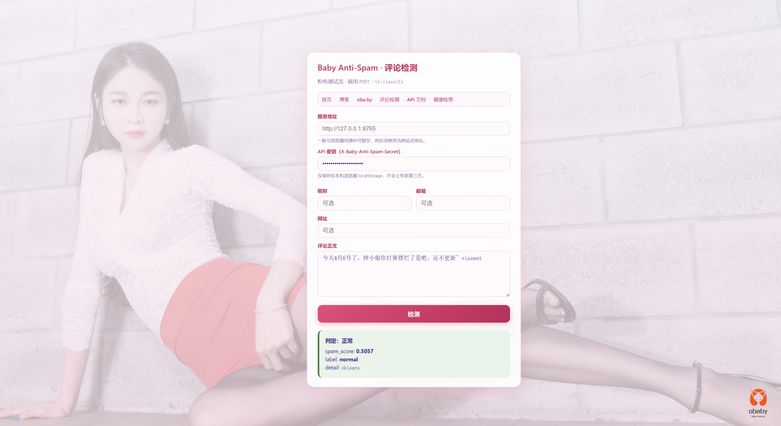 测试地址:https://anti-spam.zhongxiaojie.cn/test/spam
