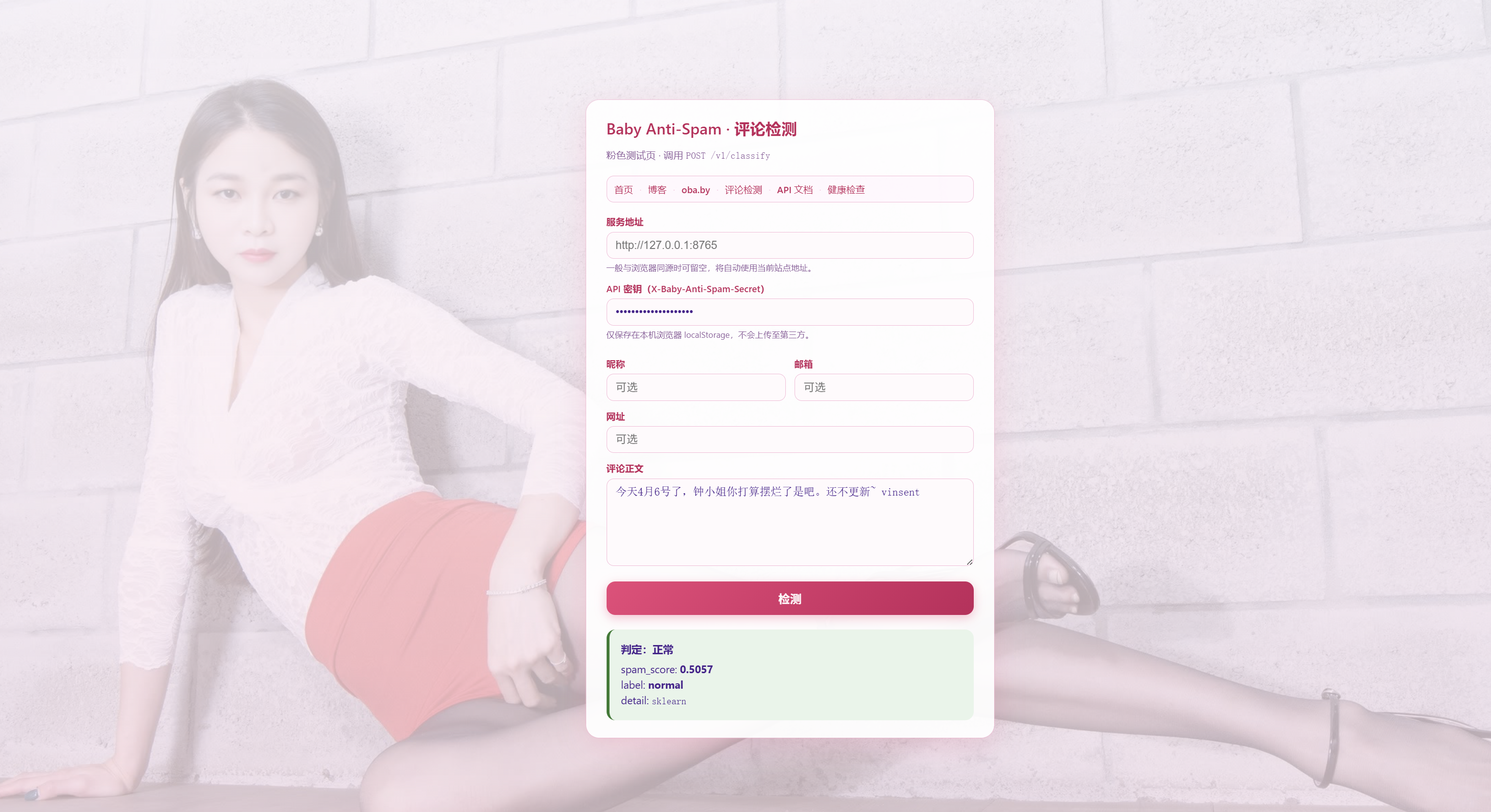 测试地址:https://anti-spam.zhongxiaojie.cn/test/spam