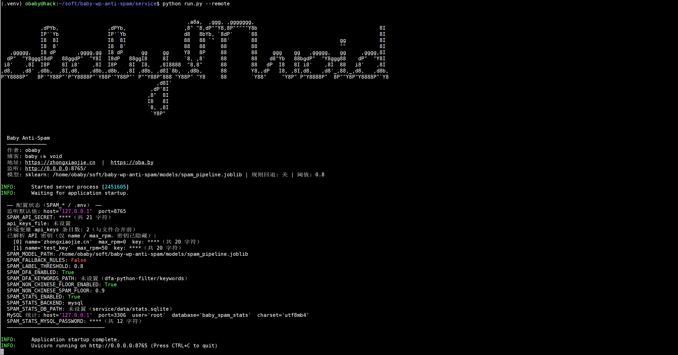 说明:如果自己不想训练数据,下载发布版的spam_pipeline.joblib 放入指定目录下配置服务启动即可,baby-anti-spam.zip 为wp插件。